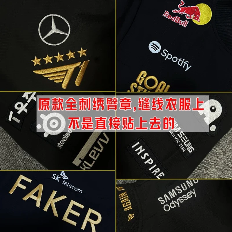 • Logos: Gold "FAKER" + T1 six-star badge on back; all sponsor logos (embroidery)